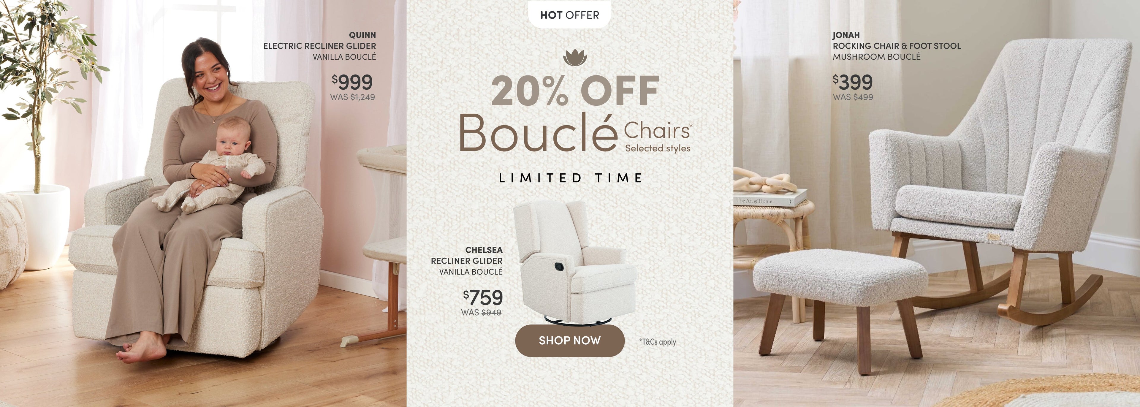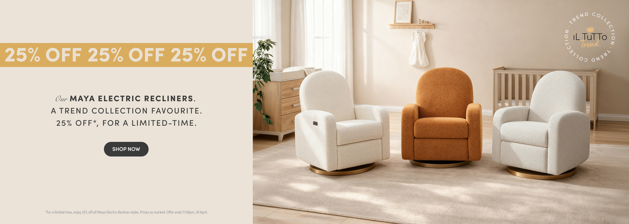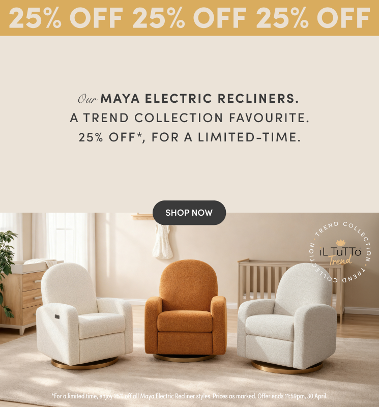Our award-winning collection includes premium nursery chairs, cots, chests, and bassinets designed for comfort, safety, and style. The exclusive Trend Collection features the best-selling Frankie and Louie chairs in teddy-fleece and corduroy, alongside premium New Zealand timber cots and chests. We also offer trusted global baby brands including Boba carriers, CoZee® bedside co-sleepers and sustainable sleepwear from Grow Kindly. Discover the best in nursery furniture and essentials — loved by Australian parents since 2007.