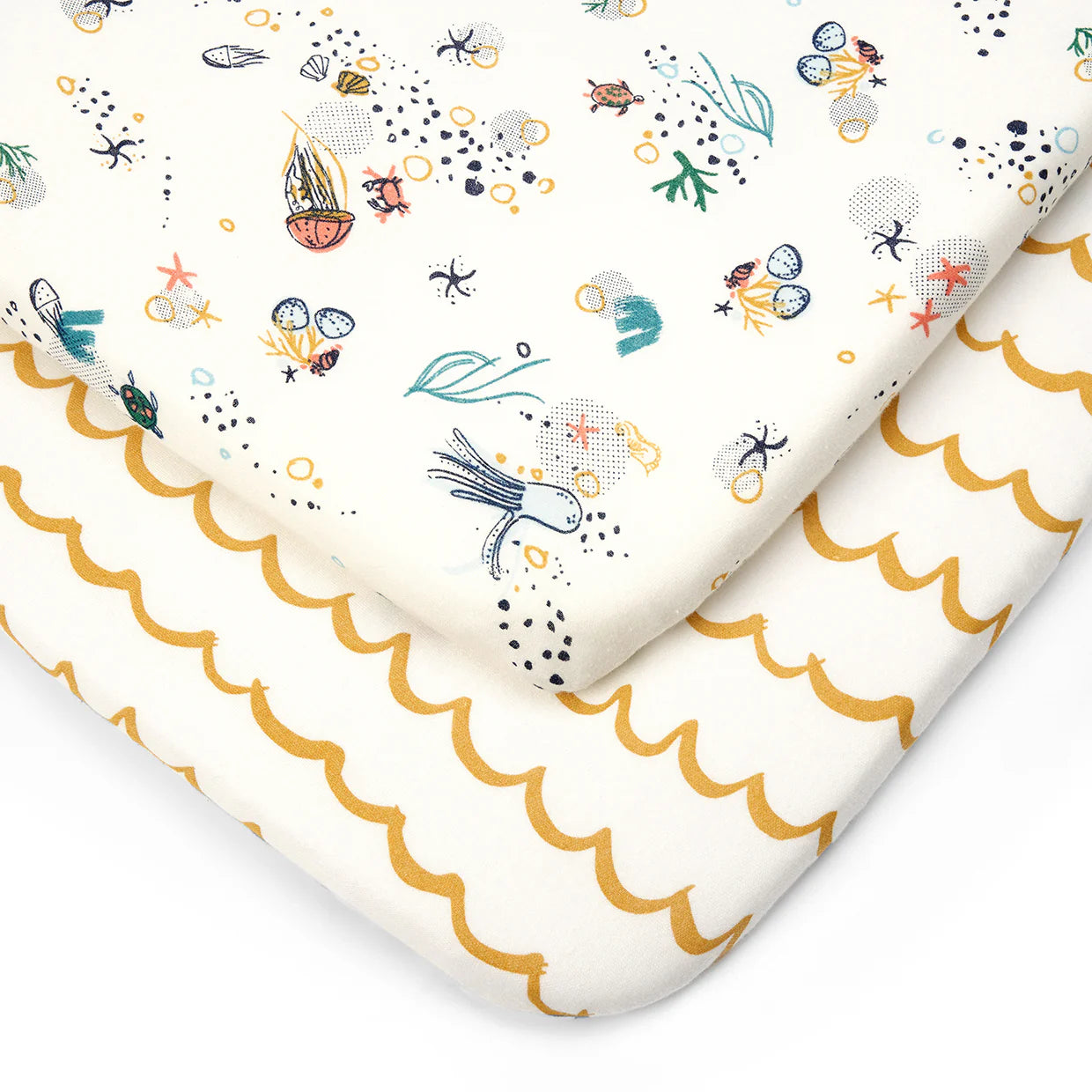 Made from breathable bamboo jersey this starter pack by Tutti Bambini is the perfect bedding bundle for your baby’s first crib. The set includes two fully tailored crib fitted sheets, with double seams for added strength and security, and a matching coverlet that is lightweight and reversible, to keep your baby comfortable and cosy all night. With an exuberant marine theme featuring sea creatures and evocative waves, the set co-ordinates with the rest of Our Planet collection.