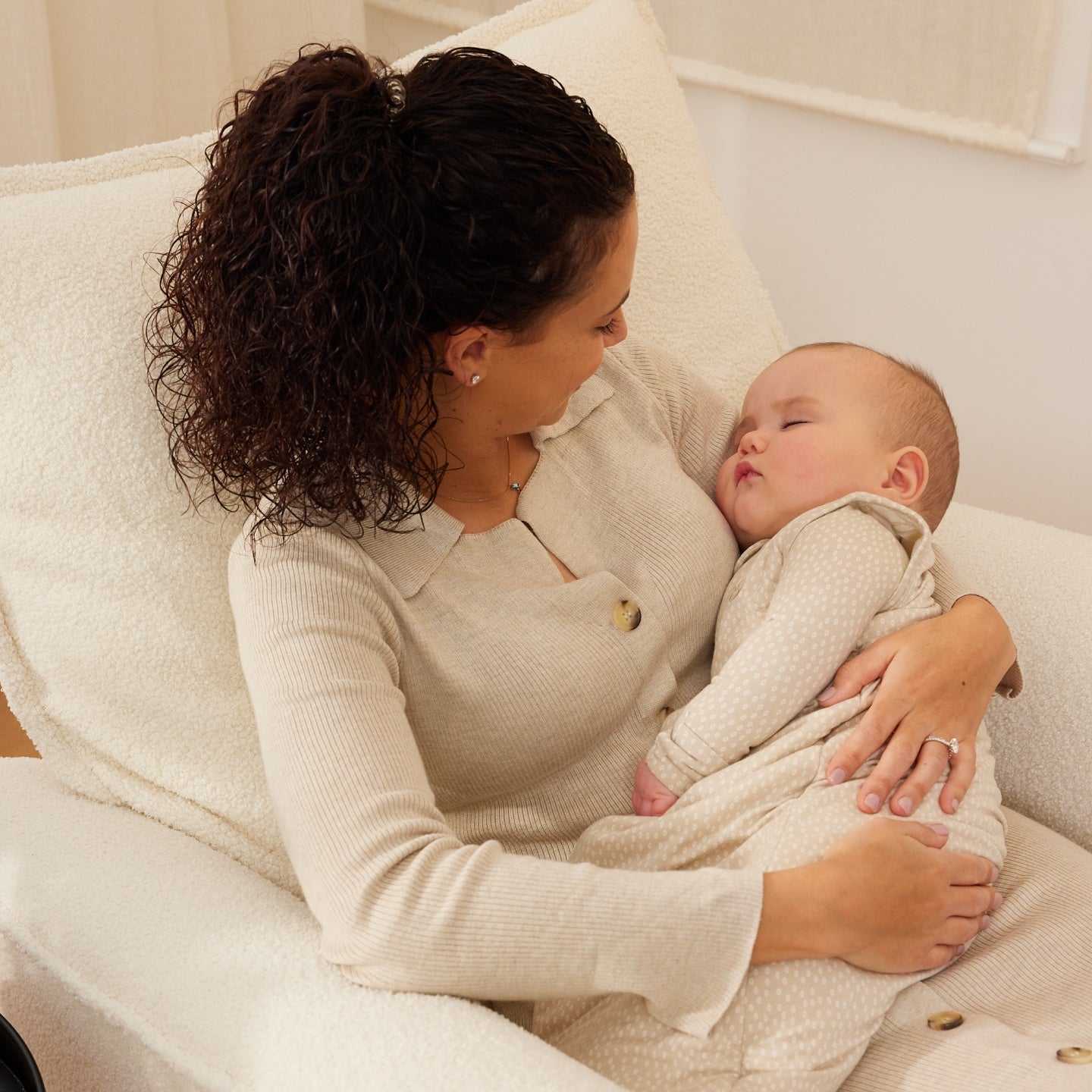 Wrapped in our coconut teddy-fleece fabric, the Louie Chair offers an unparalleled level of softness and luxury. It's like sitting on a cloud while cuddling the softest teddy bear. The new padded armrests and backrest ensure you remain comfortable during extended use. This nursery chair is the softest and most luxurious option in our range, providing you with a cosy and inviting spot to bond with your baby.