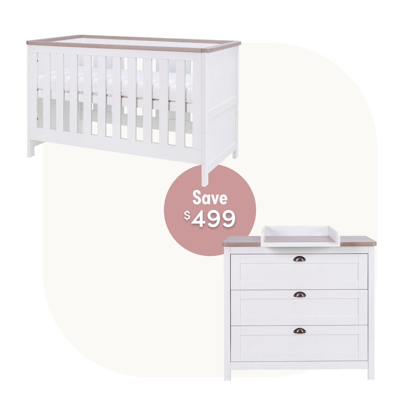 Create a timeless and adaptable nursery with the beautifully crafted Verona Cot & Chest Set in Oak White.