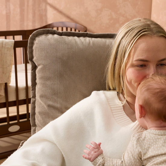 Upholstered in a premium corduroy fabric, the subtle ridged finish adds depth and visual interest, elevating the look of any modern nursery. The Mocha tone enhances the richness of the texture, creating a warm and grounded aesthetic.