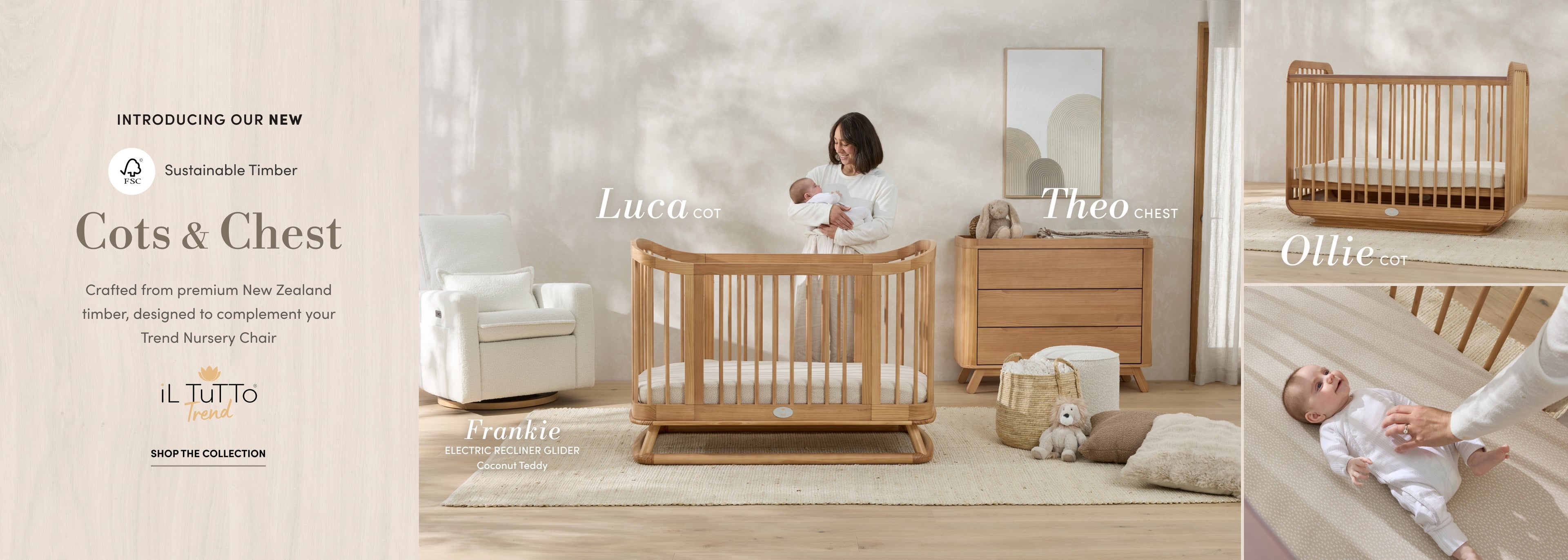Our award-winning collection includes premium nursery chairs, cots, chests, and bassinets designed for comfort, safety, and style. The exclusive Trend Collection features the best-selling Frankie and Louie chairs in teddy-fleece and corduroy, alongside premium New Zealand timber cots and chests. We also offer trusted global baby brands including Boba carriers, CoZee® bedside co-sleepers, Snuggle Me Organic support pillows, and sustainable sleepwear from Grow Kindly. Discover the best in nursery furniture and essentials — loved by Australian parents since 2007.