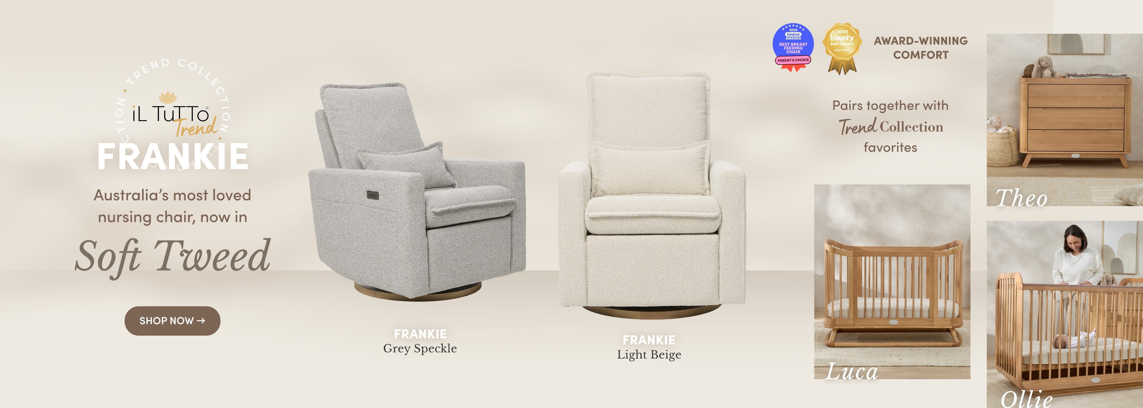 Our award-winning collection includes premium nursery chairs, cots, chests, and bassinets designed for comfort, safety, and style. The exclusive Trend Collection features the best-selling Frankie and Louie chairs in teddy-fleece and corduroy, alongside premium New Zealand timber cots and chests. We also offer trusted global baby brands including Boba carriers, CoZee® bedside co-sleepers and sustainable sleepwear from Grow Kindly. Discover the best in nursery furniture and essentials — loved by Australian parents since 2007.