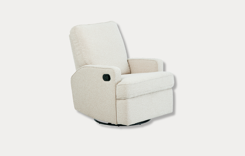 Bonne-nuit Paige Recliner & Glider in Vanilla Bouclé! Vanilla Bouclé meets clean lines and minimalist style, providing gliding comfort that will last a lifetime in your home, also featuring a full-recline, 360 degrees of swivel and an extra cushion for lower back support or for support while feeding your baby.