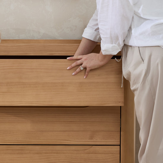 The Theo Chest is a versatile storage piece featuring deep drawers and a recessed top surface, crafted from solid New Zealand timber to complement the Luca and Ollie Cots.
